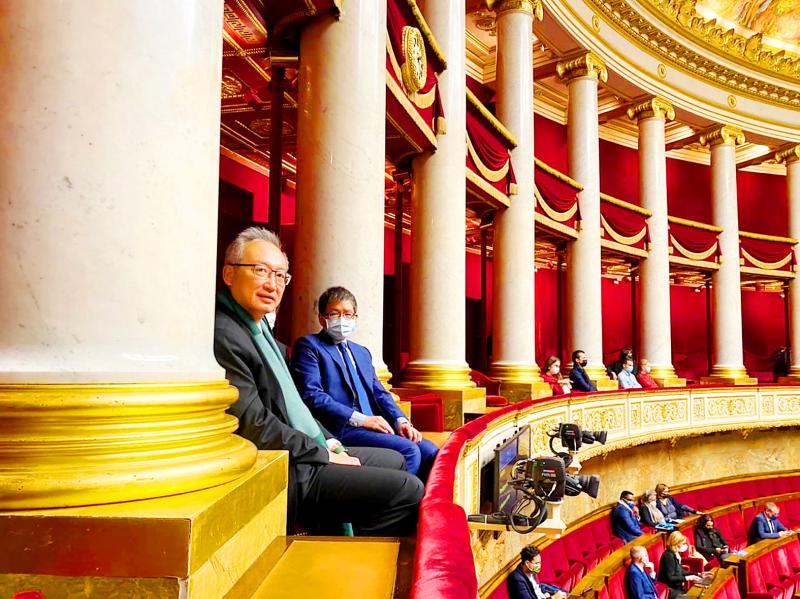 Đại diện của Đài Loan tại Pháp, ông Francois Wu (trái), đang có mặt trong tòa nhà Quốc hội Pháp hôm thứ Hai (29/11) khi Quốc hội bỏ phiếu thông qua nghị quyết ủng hộ Đài Loan tham gia các tổ chức quốc tế. (Ảnh do ông Francois Wu cung cấp cho Taipei Times).