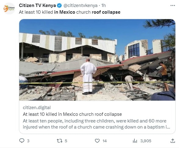 Cảnh sát cho biết nhà thờ Santa Cruz tại thành phố bờ biển Ciudad Madero, bang Tamaulipas, Mexico đã bị sập mái vào thời điểm đang hành lễ với khoảng 100 người tham dự. Ít nhất 10 người đã thiệt mạng, trong đó có 2 trẻ em. 49 người đã được đưa tới bệnh viện cấp cứu.