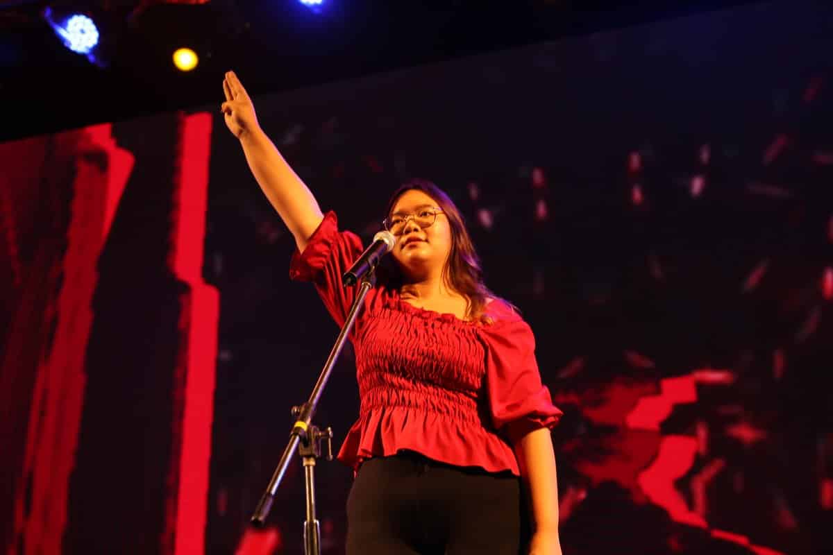 Trên sân khấu tại khuôn viên vùng ngoại ô của một trong những trường đại học hàng đầu Thái Lan, một cô gái trẻ với mái tóc dài gợn sóng và cặp kính đẹp mắt bước tới, xuyên qua lớp khói đá khô đầy ấn tượng và đọc bản tuyên ngôn 10 điểm cho một đám đông sinh viên đang cổ vũ.