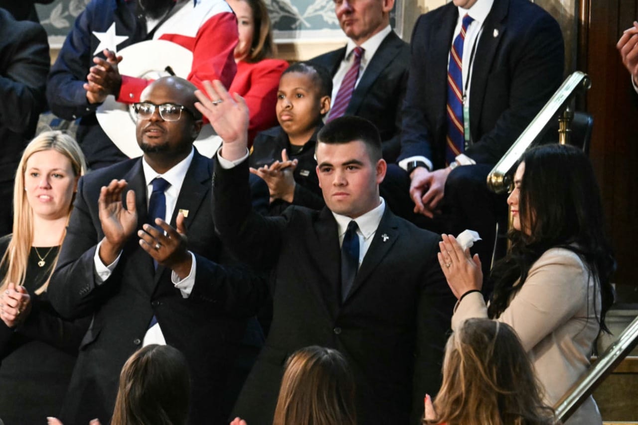 Jason Hartley (giữa) đứng dậy vẫy tay sau khi Tổng thống Hoa Kỳ Donald Trump thông báo rằng Hartley đã được nhận vào Học viện Quân sự Hoa Kỳ West Point trong bài phát biểu của Trump tại phiên họp chung của Quốc hội tại Phòng Hạ viện của Điện Capitol Hoa Kỳ ở Washington, DC, vào ngày 4 tháng 3 năm 2025. (Ảnh: JIM WATSON/AFP via Getty Images)