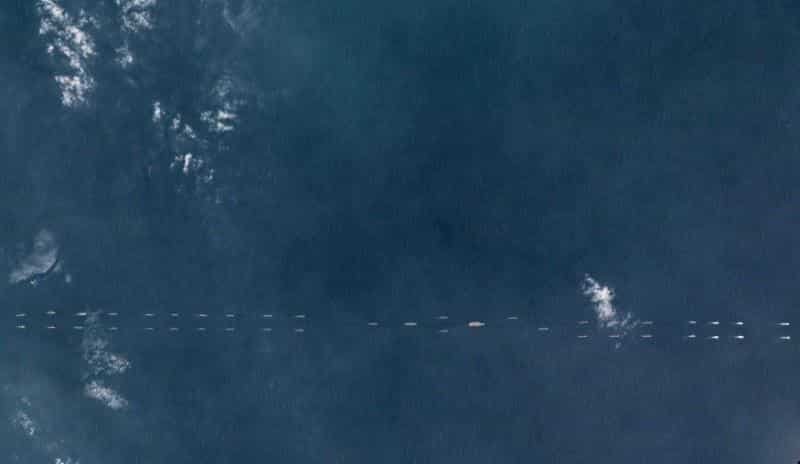 Reuters, thông qua các hình ảnh vệ tinh, chỉ ra rằng Trung Quốc đang điều động cả một đội tàu số lượng lớn hướng ra biển Đông tập trận.