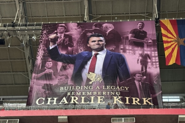 Tổ chức Turning Point America sẽ thành lập chi nhánh tại mỗi trường trung học ở Texas. Bức ảnh chụp buổi lễ tưởng niệm Charlie Kirk, một nhà hoạt động nổi tiếng người Mỹ và là người sáng lập tổ chức bảo thủ Turning Point America, được tổ chức vào ngày 21/9/2025 tại Sân vận động State Farm ở Glendale, Arizona. (Linda Jiang/The Epoch Times)