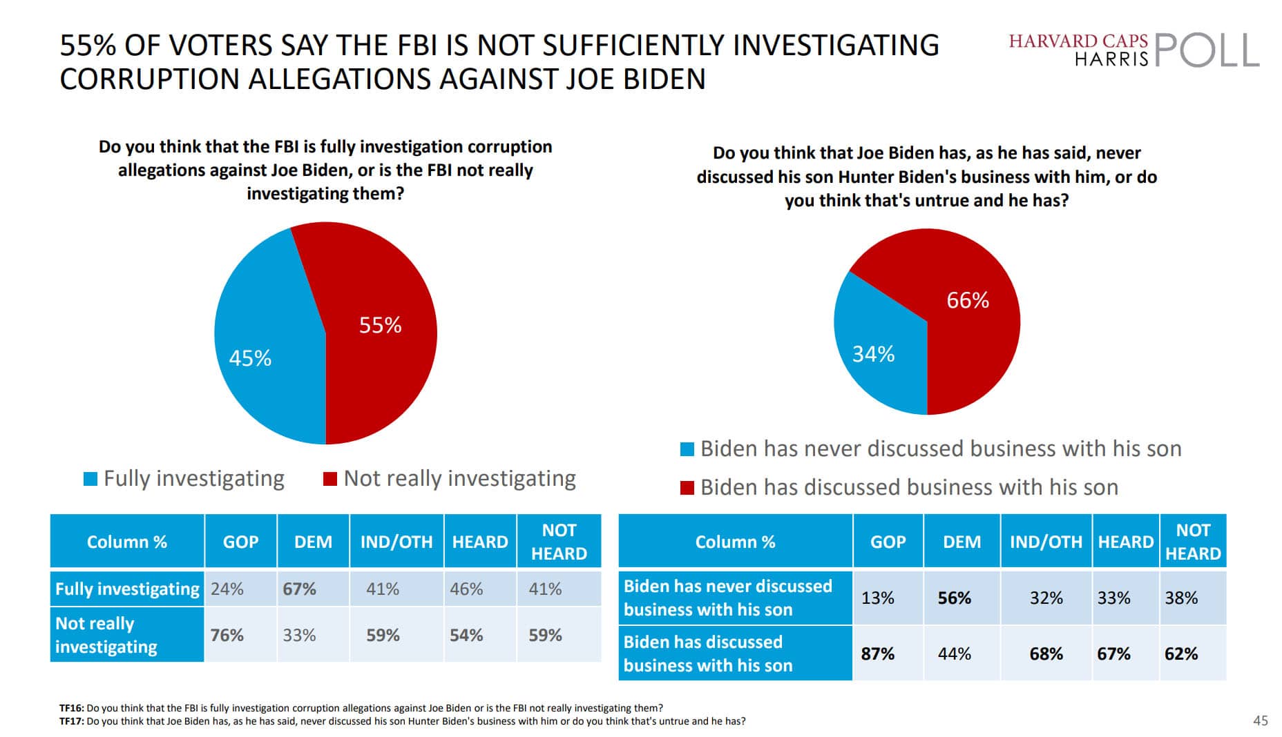 Cuộc thăm dò cũng đặt câu hỏi: “Bạn có nghĩ rằng FBI đang điều tra đầy đủ các cáo buộc tham nhũng với ông Joe Biden, hay FBI không thực sự điều tra chúng?”