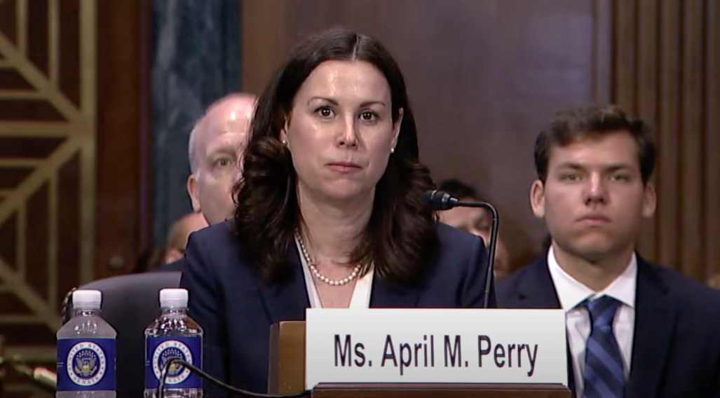 Bà April Perry phát biểu trước Ủy ban Tư pháp Thượng viện vào ngày 31 tháng 7 năm 2024. (Ảnh: Trích xuất ảnh YouTube Thượng nghị sĩ Dick Durbin)