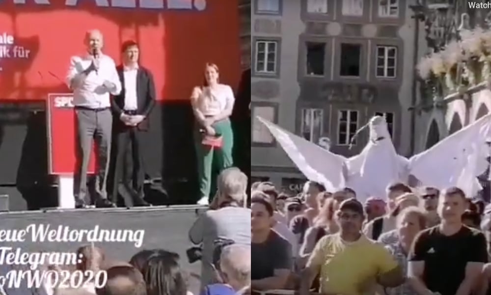 Trước đám đông la ó phản đối và gọi ông là “kẻ hiếu chiến”, “tên lụn bại”, “thằng lừa đảo”, v.v. xen lẫn những tiếng hoan hô ủng hộ, trong một sự kiện của đảng SPD của mình tại quảng trường Marienplatz ở Munich chiều 18/8, Thủ tướng Đức Olaf Scholz chỉ trích gay gắt những ai phản đối việc chính quyền ông ủng hộ chiến tranh Ukraine. Ông gọi đó là những “phần tử dân túy cánh hữu” đại biểu cho “tương lai ảm đạm” của nước Đức, và miêu tả họ không phải là những con chim bồ câu hòa bình (như hình ảnh họ giương lên) mà là “những thiên thần sa đọa đến từ địa ngục, bởi vì rốt cuộc họ đang biện minh cho kẻ hiếu chiến” (ám chỉ Tổng thống Nga Vladimir Putin).