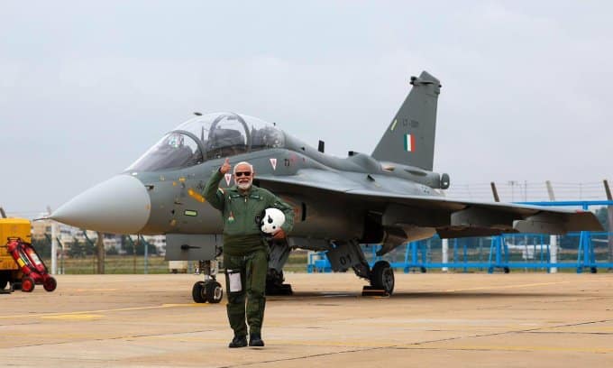 Thủ tướng Ấn Độ Narendra Modi ngày 25/11 đăng thông điệp ủng hộ nền công nghiệp quốc phòng nội địa kèm hình ảnh ông ngồi trên tiêm kích hạng nhẹ Tejas.