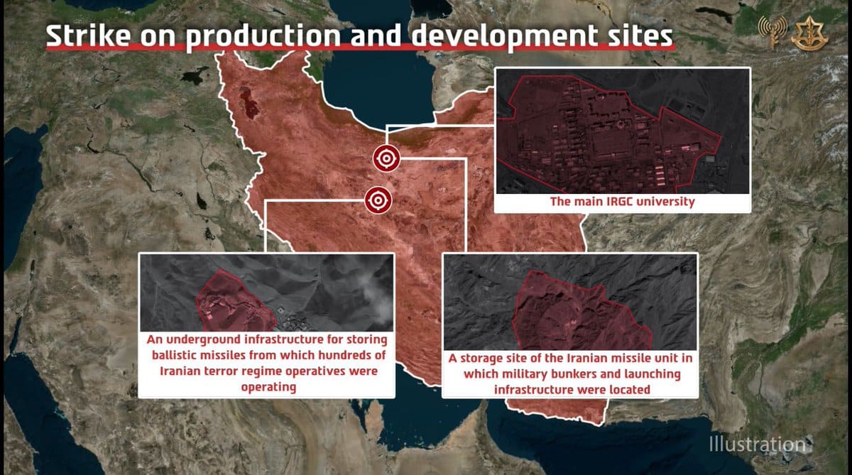 Ngoài ra, quân đội Israel đã phá hủy nhiều kho chứa tên lửa đạn đạo, trung tâm chỉ huy ngầm và các địa điểm phóng tên lửa ở miền tây và trung Iran. Tình báo Israel cho biết “các quan chức cấp cao của chế độ Iran” đang hoạt động trong trung tâm chỉ huy ngầm vào thời điểm xảy ra vụ tấn công.