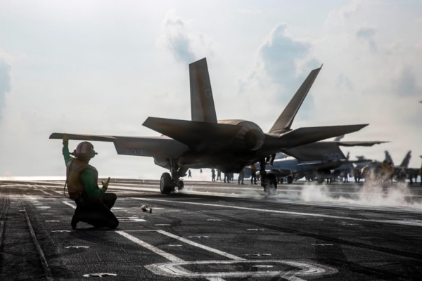 Ngày 21 tháng 3 năm 2026, một máy bay chiến đấu F-35C Lightning II cất cánh từ sàn đáp của tàu sân bay USS Lincoln (CVN 72) để hỗ trợ Chiến dịch Epic Fury. (Hải quân Hoa Kỳ)