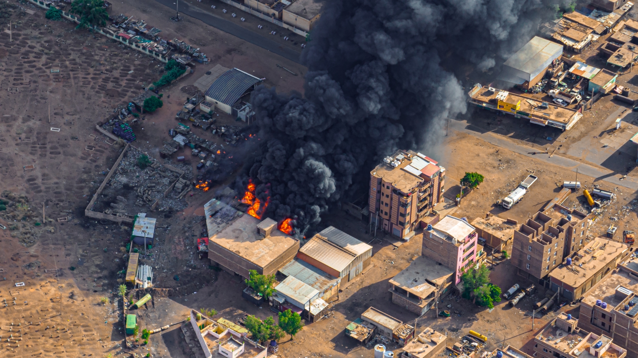 Ảnh chụp từ trên không ngày 28 tháng 6 năm 2023 cho thấy một vụ cháy lớn tại một trong những tòa nhà ở thành phố Omdurman do các cuộc đụng độ dữ dội giữa Lực lượng Hỗ trợ Nhanh và Lực lượng Dự bị Trung ương. (Ảnh: Shutterstock)