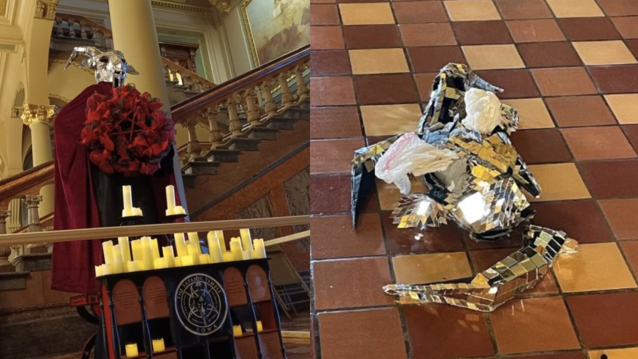Việc trưng bày Đền Satan được cho phép theo luật của tiểu bang Iowa, cho phép bất kỳ tổ chức tôn giáo nào tổ chức trưng bày bên trong tòa nhà Hội đồng tiểu bang. Nó bao gồm một bức tượng nạm đá quý của quỷ đầu dê Baphomet, với những ngọn nến cầu nguyện bên cạnh.