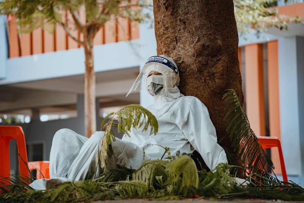 Một nhân viên y tê ngồi nghỉ mệt dưới gốc câu trong một buổi lấy mẫu xét nghiệm COVID-19 cộng đồng, tại Vũng Tàu, ngày 28/11/2021. (Ảnh minh họa: Dong Nhat Huy/Shutterstock)