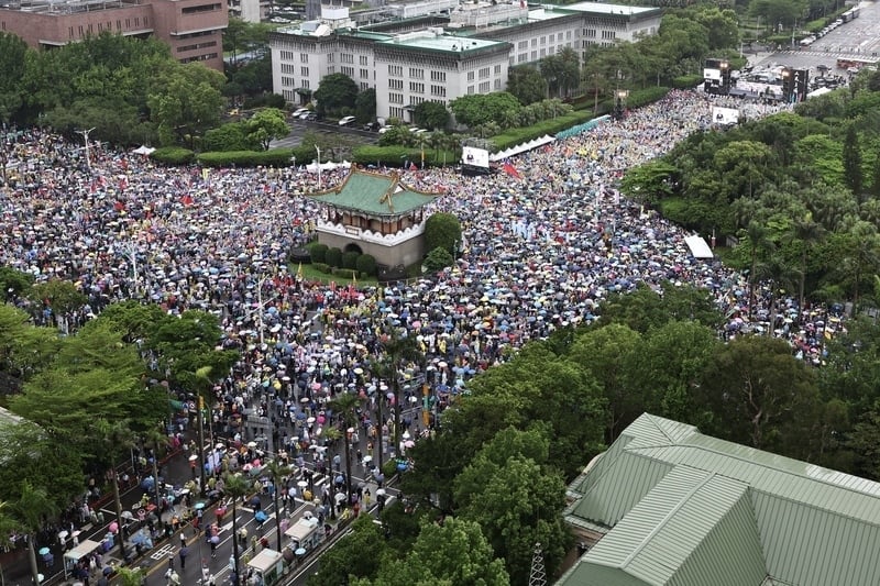 Chiều 26/4, Quốc Dân Đảng tổ chức sự kiện tập hợp "Phản đối đảng Xanh thân Cộng, Chiến đấu chống độc tài – Cùng đứng lên tại Đại lộ Ketagalan!". Người tham dự đông đến mức chen kín cả vòng xoay Cảnh Phúc Môn. (Nguồn ảnh: CNA)