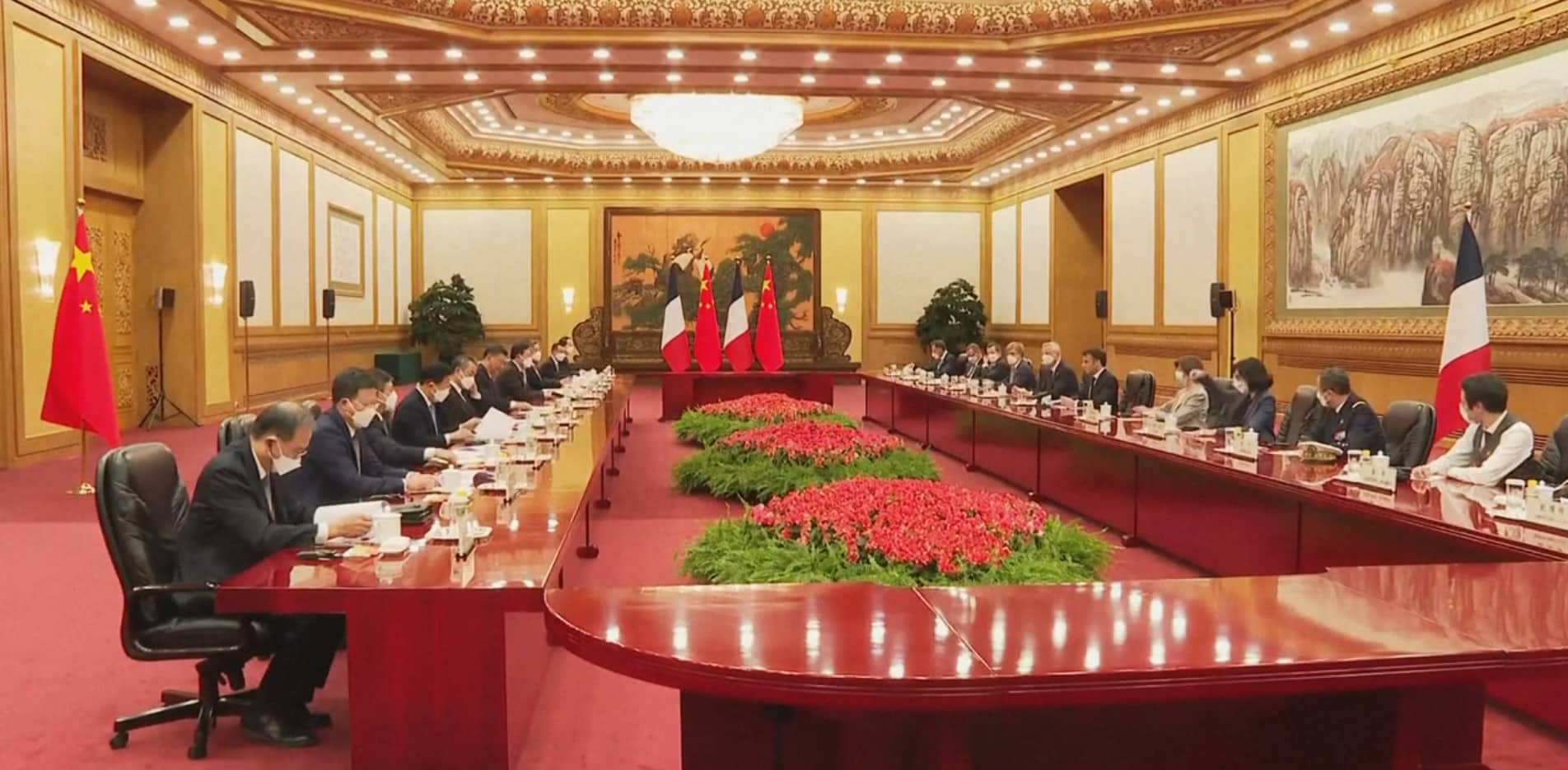 Một nhà báo của AFP cho biết Chủ tịch Trung Quốc Tập Cận Bình chào đón vị khách của mình trên một tấm thảm đỏ khổng lồ trải đầy cờ Trung Quốc và Pháp khi quốc ca của các nước vang lên.