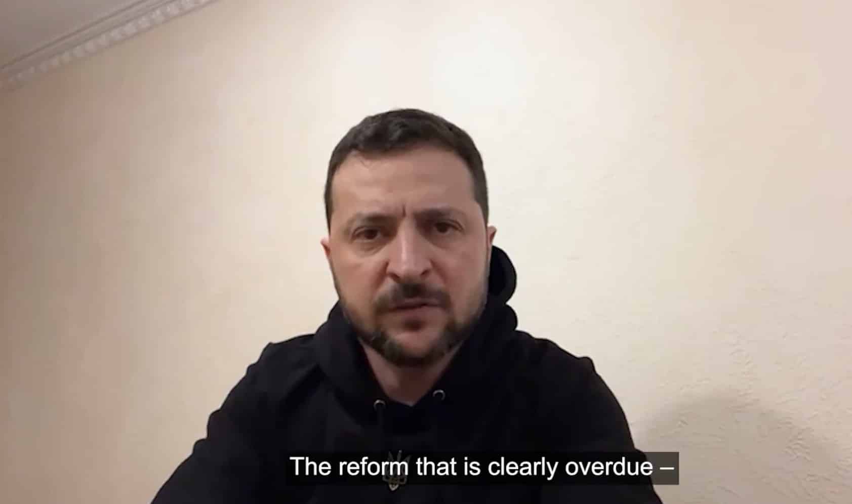 “Không có lý do nào có thể ngăn cản việc cải cách các thể chế toàn cầu, đặc biệt là Hội đồng Bảo an LHQ. Cuộc cải cách như vậy giờ cũng là chậm rồi đó,” TT Zelensky phát biểu tối 1/4. (Ảnh cắt từ video tweet của ông)