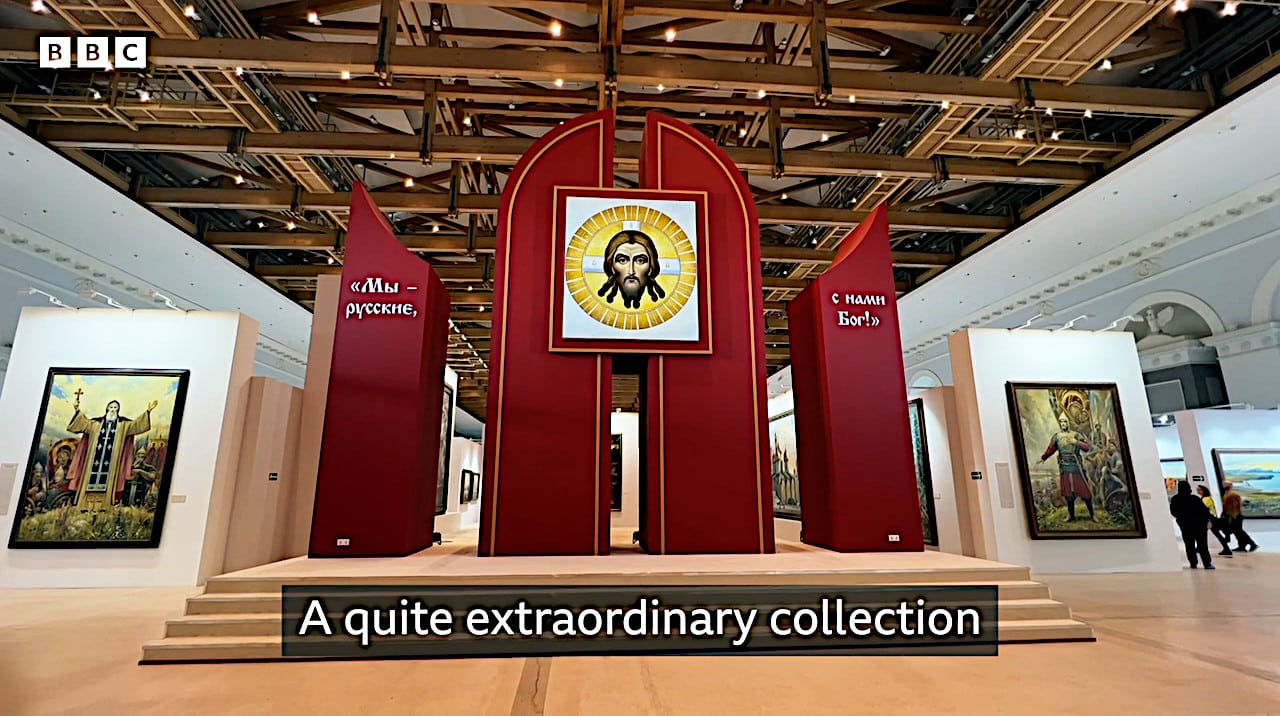 Nhân ngày Nước Nga (Rôssia) 12/6, biên tập BBC tiếng Nga, ông Steve Rosenberg, đã tới triển lãm mang tên “Chúng ta là người Nga! Chúa ở bên chúng ta!” ở Moskva, cách không xa Điện Kremlin, để làm một video phỏng vấn ngắn. “Một bộ sưu tập tuyệt vời!”, ông thán phục trước các bức tranh sơn dầu về tín ngưỡng đồng thời ủng hộ chiến tranh trong triển lãm. Phỏng vấn của ông dường như đã gợi mở, nhưng không nói lời kết luận, về vấn đề cuộc chiến mà dân Nga đang phải chèo chống khi bị toàn NATO tập trung vào công kích trên mọi phương diện.