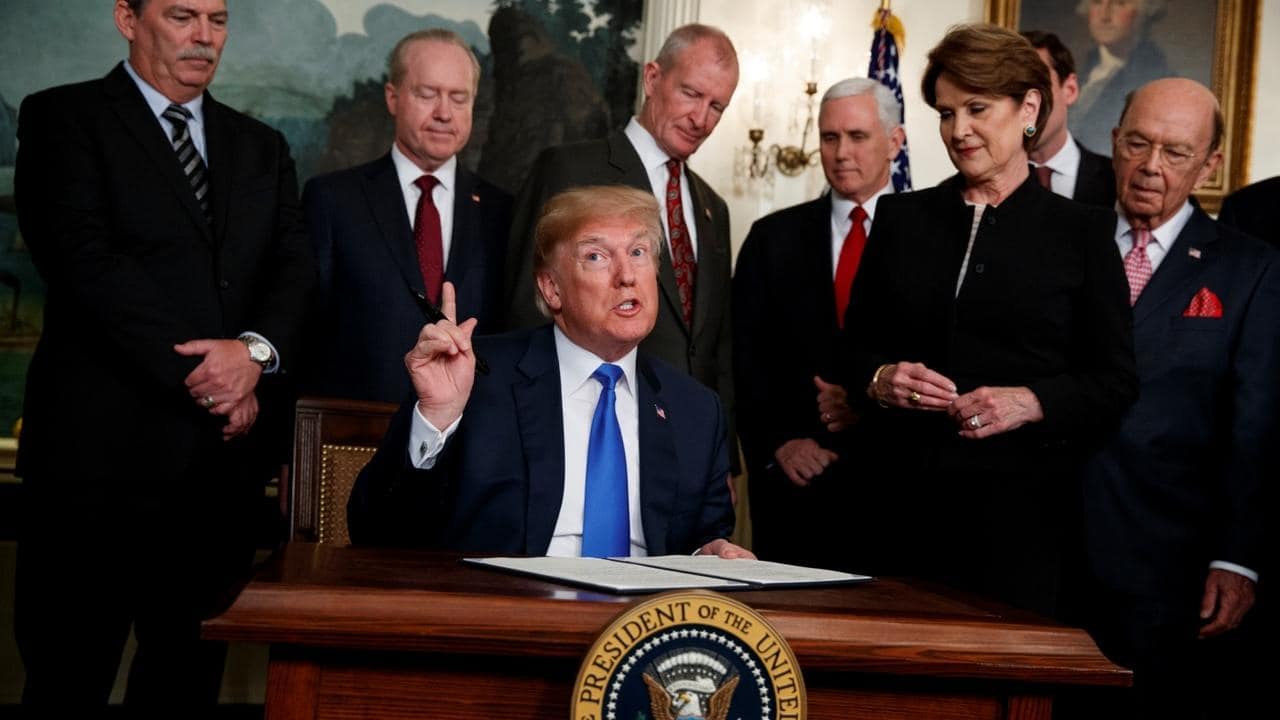 Xuất hiện tại Nhà Trắng cùng Bộ trưởng Thương mại Wilbur Ross, Đại diện Thương mại Mỹ Robert Lighthizer và các quan chức khác, Tổng thống Trump đã thông báo các chính sách thương mại mới với Trung Quốc.