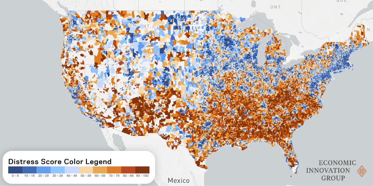 Theo báo cáo của EIG, trong những năm phục hồi kinh tế, các cộng đồng tầng trên đã lấy lại được sự thịnh vượng. Trong khi đó, phần lớn các vùng khó khăn vẫn phải đối mặt với tình trạng sụt giảm việc làm, doanh nghiệp và cả dân số. Khoảng cách giàu nghèo giữa vùng thịnh vượng và khó khăn ngày càng lớn hơn.