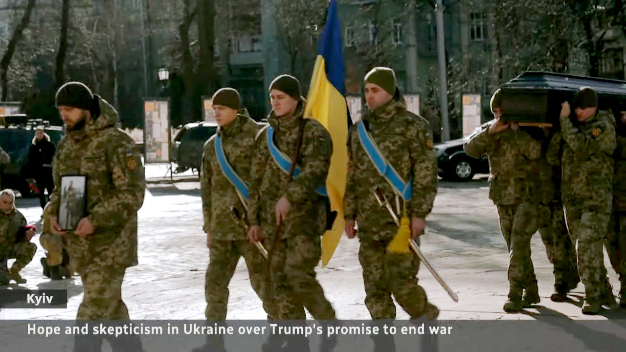 - Video CBC News phỏng vấn tại Kiev với mở đầu là cảnh đưa tang thê lương trong mùa Đông giá lạnh binh lính tử chiến: Nhân dân Ukraine mong có được hòa bình như ông Trump hứa khi tranh cử, tuy nhiên, họ đồng thời cảm thấy điều đó khó trở thành hiện thực (hope and skepticism). “Nhưng mà, để Ukraine thua trận thì sẽ ảnh hưởng xấu đáng kể tới vai trò lãnh đạo của Mỹ trên quốc tế,” theo một người phỏng vấn nói với phóng viên. Ông chủ của một quán mang tên “Trump Cafe” đã nói rằng ông “ủng hộ ông Trump để ông ấy thực hiện được phép màu nhiệm” đem lại hòa bình cho Ukraine và chính trị lành mạnh cho Kiev: