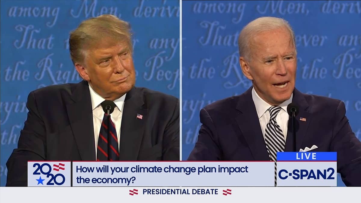 Ông Biden đáp trả rằng ông Trump nói thế là hoàn toàn sai lầm. Cựu phó tổng thống giải trích rằng trong nhiệm kỳ lần trước [với Obama] “chúng tôi đã có thể cắt giảm giá năng lượng tái tạo rất rất nhiều. Không ai có thể tiếp tục xây dựng các nhà máy than và gas ở nước Mỹ nữa và họ sẽ phải chuyển sang năng lượng tái tạo. Các đội xe liên bang sẽ đều phải chuyển sang xe điện. Chúng ta sẽ xây dựng 500.000 trạm nạp điện, dọc theo các đường cao tốc khắp nơi. Chúng ta sẽ tạo ra hàng nghìn việc làm. Chúng ta sẽ đạt được net-zero về việc sử dụng (và tạo ra) năng lượng trước 2035. Chúng ta sẽ quay lại thỏa thuận Paris vì không có chúng ta, họ đang làm rất tệ. Rừng ở Brazil đang mất đi và nó là một phần đáng kể thu nạp khí carbon. Tôi sẽ mang đến 20 tỷ USD và nói với họ rằng họ phải ngừng chặt cây”.