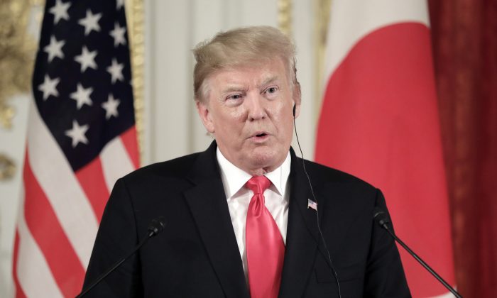 Tổng thống Hoa Kỳ Donald Trump phát biểu trong buổi họp báo chung với Thủ tướng Nhật Bản Abe Shinzo tại Cung điện Akasaka, Tokyo, Nhật Bản, hôm 27/5/2019. (Ảnh: Kiyoshi Ota/Bloomberg via Getty Images)