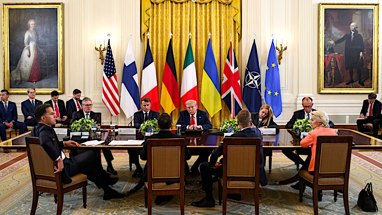 Tổng thống Mỹ Donald Trump thông báo cuộc họp với dàn lãnh đạo EU và Kiev tại Nhà Trắng hôm Thứ Hai đã kết thúc khi “mọi người đều rất vui”, và bước tiếp theo sẽ là cuộc họp thượng đỉnh Nga-Ukraine và thượng đỉnh ba bên Mỹ-Nga-Ukraine. Trong thông điệp trên Truth Social, ông cho hay Mỹ và EU/Kiev đã thống nhất phương án đảm bảo an ninh cho Ukraine là được thực hiện bởi EU với “sự phối hợp” của Mỹ. Ông Trump có dành một đoạn thời gian để có một cuộc điện đàm với Tổng thống Nga Vladimir Putin. Ông cũng có một cuộc họp với Tổng thống Ukraine ở phòng Bầu Dục. Ngoài bức ảnh mang tính chính thống về cuộc họp, thì ông Trump còn cho đăng một bức ảnh đen trắng chụp ông và ông Zelensky kèm bình luận “theo đuổi hòa bình.” Khi trả lời phóng viên, ông Zelensky có đoạn nói: “chúng tôi mua vũ khí của Mỹ, và nhờ EU trả tiền” và ông cần tiền không phải chỉ là chi cho chiến tranh và bảo vệ Ukraine bây giờ, mà còn là để “đảm bảo an ninh” và “tái vũ trang” cho Kiev.