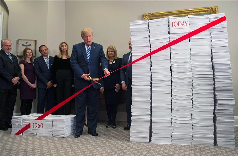 Được biết, ngay khi bước vào nhiệm sở Tổng thống Trump đã ra chính sách rằng mỗi một quy định mới ban hành phải kèm theo hủy bỏ hai quy định cũ. Thậm chí, chính phủ Trump đã thực hiện nhiều hơn thế, theo Văn phòng Quản lý và Ngân sách (OMB), trong năm tài khóa đầu tiên trung bình chính phủ đã hủy bỏ 12 quy định cũ cho mỗi đề xuất quy định mới. Theo Washington Examiner, tính riêng trong năm 2018, mỗi quy định mới được ban hành đã kèm theo 22 quy định cũ bị hủy bỏ.