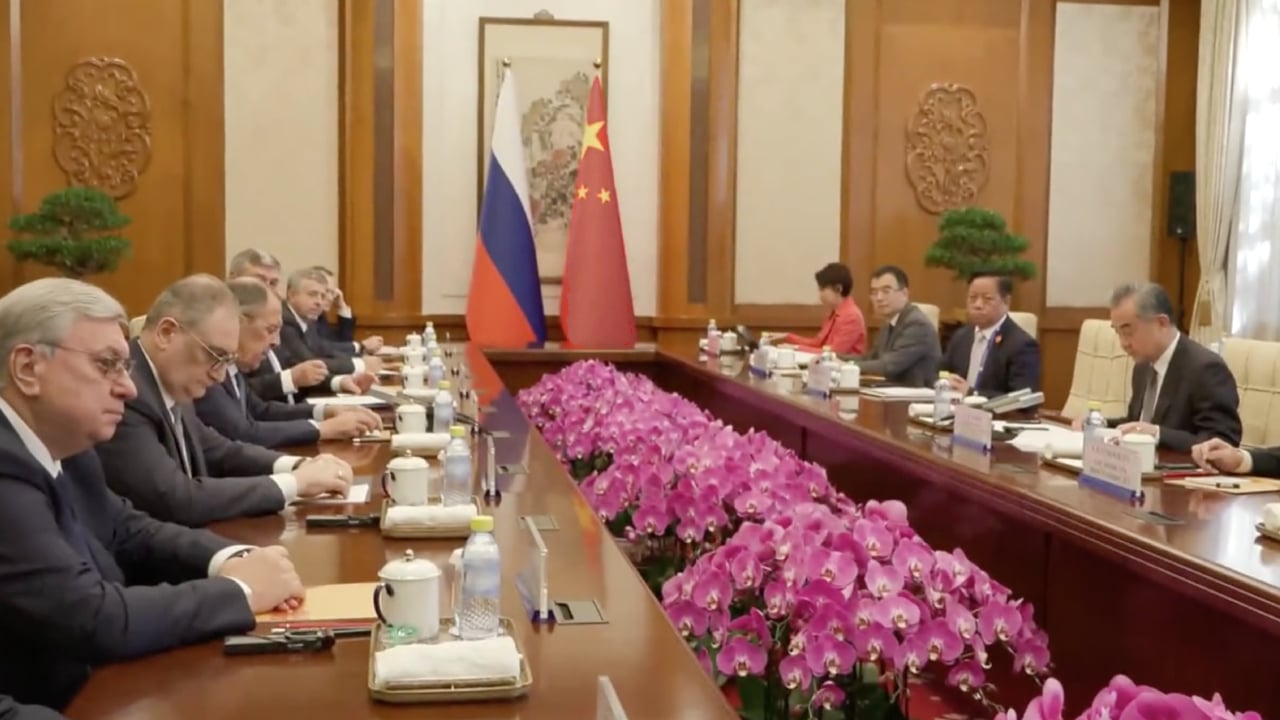Ngoại trưởng Nga Lavrov trong cuộc họp với người đồng cấp Trung Quốc Vương Nghị ở Bắc Kinh. (Ảnh chụp màn hình video)