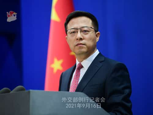 Người phát ngôn Bộ Ngoại giao Trung Quốc Triệu Lập Kiên nói trong một cuộc họp báo thường kỳ hôm thứ Năm (16/9) rằng quyết định của ba chính phủ hợp tác về chương trình tàu ngầm chạy bằng năng lượng hạt nhân của Úc “phá hoại hòa bình và ổn định của khu vực và tăng cường chạy đua vũ trang.”