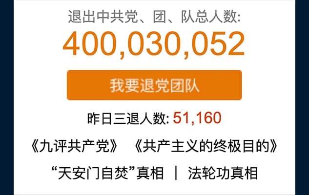 Theo số liệu thống kê trên trang web của Trung tâm Dịch vụ thoái ĐCSTQ Toàn cầu, 7:00 tối theo giờ Bắc Kinh vào ngày 3/8/2022, số người thoái đảng, đoàn và đội của Đảng Cộng sản Trung Quốc (ĐCSTQ) đã vượt mốc 400 triệu người.