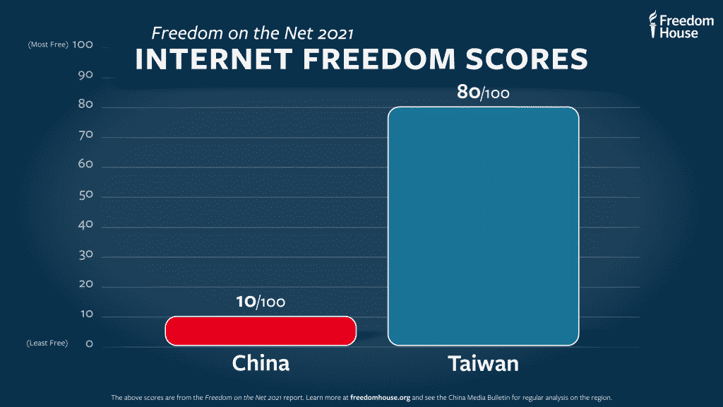 Trong báo cáo Tự do Internet năm 2021 của Freedom House được công bố vào tháng 9, Đài Loan nằm trong số sáu “quốc gia mới” được đưa vào danh sách, xếp vị trí thứ năm trên thế giới về tự do Internet. Ở chiều ngược lại, Trung Quốc xếp chót bảng – vị trí nước này đã nắm giữ trong năm thứ bảy liên tiếp.