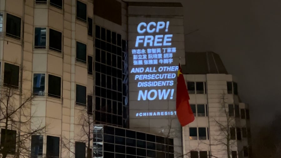 Vào khoảng 19h tối ngày 1/1/2026, lần đầu tiên trên tường ngoài của tòa nhà Đại sứ quán Trung Quốc tại Đức xuất hiện một màn chiếu chống cộng kích cỡ lớn, với chủ đề “Hòa bình, Dũng cảm, và Kháng cự phi bạo lực”, thể hiện sự quan tâm đến tình trạng nhân quyền và yêu cầu chính trị. Theo Vision Times, đây là lần đầu tiên tổ chức phi lợi nhuận nước ngoài “China Action” mở rộng các hoạt động biểu tình công dân từ Bắc Mỹ sang châu Âu.