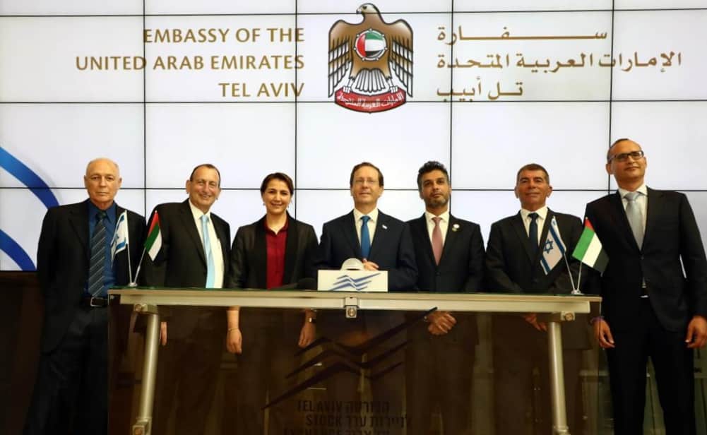 Các Tiểu vương quốc Ả Rập Thống nhất (UAE) hôm thứ Tư trở thành quốc gia vùng Vịnh đầu tiên mở Đại sứ quán tại Israel. Phái viên của UAE đã ca ngợi các cơ hội thương mại và đầu tư mà mối quan hệ giữa hai bên sẽ mang lại tại buổi lễ thượng cờ, cùng với sự tham dự của Tổng thống Israel.