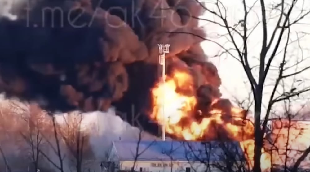 Một cuộc tấn công bằng máy bay không người lái đã đốt cháy một bể chứa dầu tại một sân bay ở Kursk, miền tây nước Nga, cách biên giới Ukraine 175 dặm. (Ảnh chụp màn hình video)