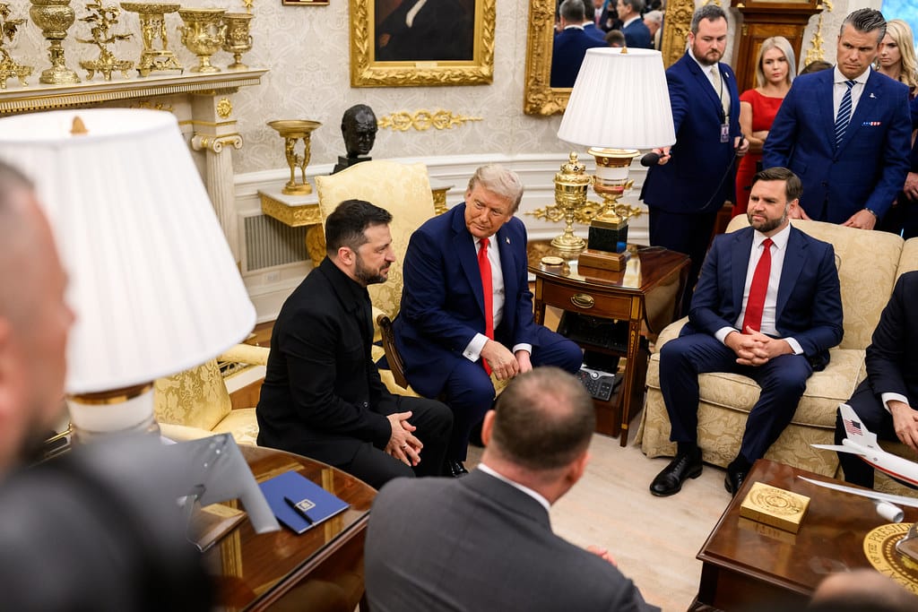 Tổng thống Donald Trump và Phó Tổng thống Vance tham dự cuộc gặp song phương với Tổng thống Volodymyr Zelensky của Ukraine, Thứ Hai, ngày 18/8/2025, tại Phòng Bầu dục. (Ảnh: Nhà Trắng/ Daniel Torok)