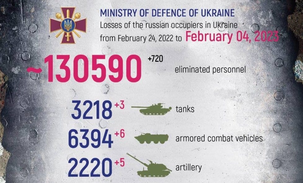 Cuộc chiến sẽ chạm mốc một năm vào ngày 24/2 tới đây và tổn thất của Nga tiếp tục tăng với tốc độ chóng mặt. Bộ Quốc phòng Ukraine hôm thứ Bảy tuyên bố rằng 720 binh sĩ Nga đã thiệt mạng vào ngày hôm trước, nâng tổng số lên 130.590 binh sĩ Nga thiệt mạng vào ngày thứ 346 của cuộc chiến.