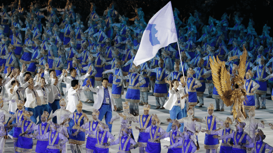 Dẫn đầu đoàn diễu hành liên Triều là hai vận động viên – ngôi sao bóng rổ Hàn Quốc Lim Yung-hui và cầu thủ bóng đá Ju Kyong-chol của Bắc Hàn – cầm lá cờ thống nhất với nền màu trắng và hình bán đảo Triều Tiên màu xanh dương. Đoàn diễu hành liên Triều nhận được sự cổ vũ khích lệ của 42.000 cổ động viên có mặt trên khán đài sân vận động Gelora Bung Karno, Jarkata, Indonesia.
