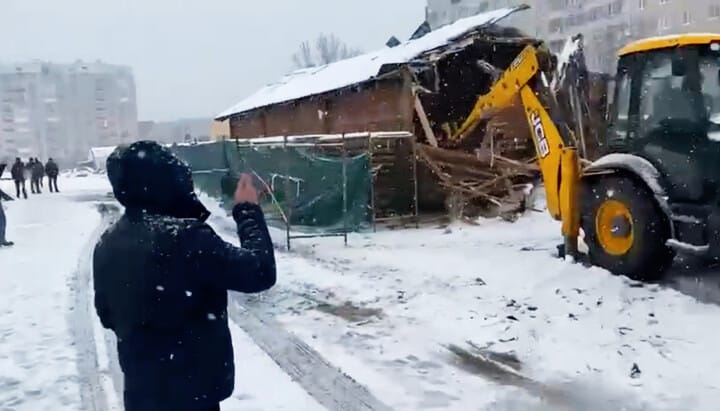 Theo một tờ báo của Ukraine đưa tin, đây là cơ sở tín ngưỡng được xây dựng tùy tiện của Giáo hội Chính thống UOC. Tháng 7/2022, cơ sở này cùng các vật phẩm của nó đã bị tịch thu và chuyển sang cho giáo hội OCU (giáo hội mà nhà nước nâng đỡ), và tới hôm 6/4 nó được đập bỏ. Trong các vật phẩm, cũng theo lời tờ báo miêu tả, có những tài liệu và tuyên truyền liên quan đến Nga.