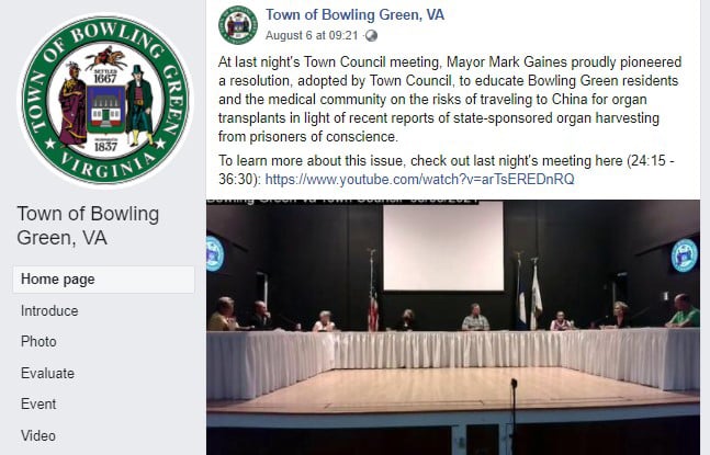 Ngày 5/8/2021 vừa qua, Bowling Green, thị trấn lâu đời nhất của tiểu bang Virginia, quận lỵ của quận Caroline, đã thông qua một nghị quyết để lên án tội ác thu hoạch tạng của Đảng Cộng sản Trung Quốc đối với tù nhân lương tâm, đặc biệt là người tập Pháp Luân Công, đồng thời nâng cao nhận thức của cộng đồng y tế và người dân địa phương đối với tội ác này.
