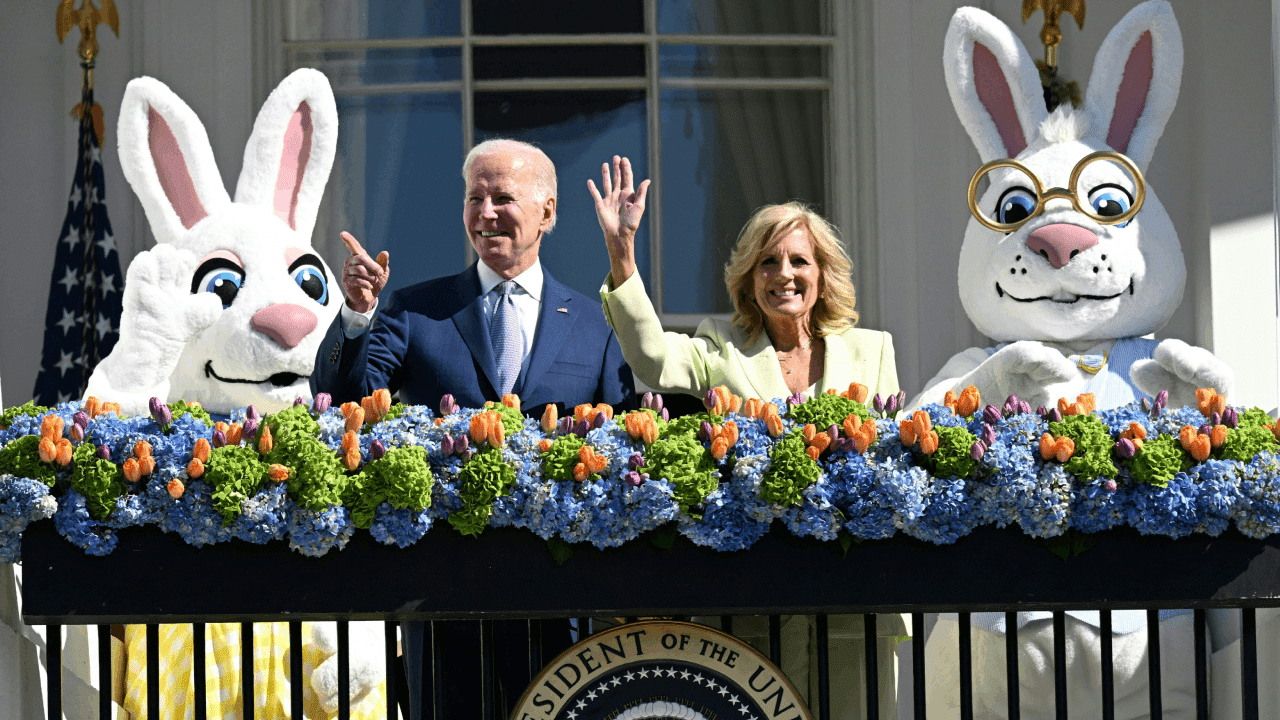 Tổng thống Hoa Kỳ Joe Biden, cùng với Đệ nhất phu nhân Jill Biden và hai chú thỏ Phục sinh, vẫy tay sau khi phát biểu tại Lễ lăn trứng Phục sinh hàng năm trên Bãi cỏ phía Nam của Nhà Trắng ở Washington, DC, vào ngày 10 tháng 4 năm 2023. (Ảnh: ANDREW CABALLERO-REYNOLDS/AFP, Getty Images)