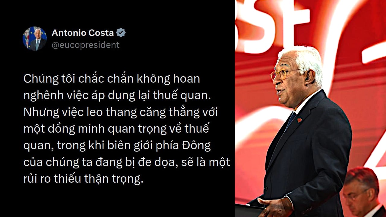 Trong tuyên bố hôm Thứ Hai của Chủ tịch Hội đồng EU Antonio Costa, tuy thông điệp chính là cảnh báo Mỹ về vấn đề thuế quan, nhưng mà, như Politico chỉ ra, nó bất ngờ thể hiện mâu thuẫn với tuyên bố trước đó của Chủ tịch Ủy ban EU Ursula von der Leyen, khiến câu hỏi ‘phải chăng lợi ích của EU đã bị bán bởi vì EU muốn tiếp tục sự nghiệp chống Nga ở Ukraine’ lại trở nên tế nhị.
