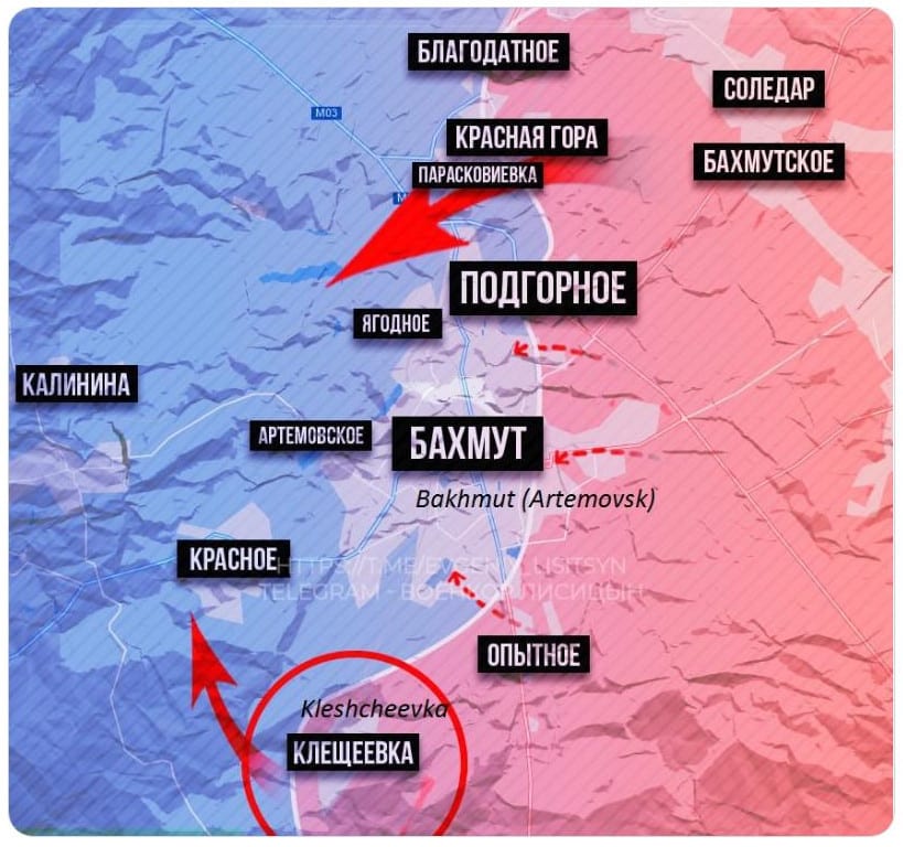 🇷🇺⚔️🇺🇦PMC Wagner took the southern suburb of Bakhmut Kleshcheevka and now Bakhmut (Artemovsk) is getting into the pincers from the north and south. The supply routes of the T0504 and M03 highways are under fire control. pic.twitter.com/d3Q9AI5jO1