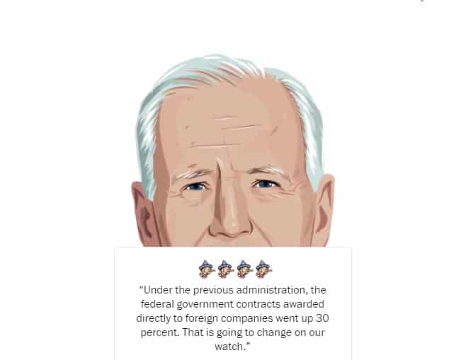 Washington Post đã chấm điểm “4 Pinocchio” cho 4 tuyên bố sai của ông Biden, 3 trong số 4 tuyên bố nhận “4 Pinocchio” là các tuyên bố sai về luật cải cách bầu cử của tiểu bang Georgia. Tuyên bố sai nhận “4 Pinocchio” còn lại của ông Biden là nói không đúng về chính quyền Trump khi cho rằng “các hợp đồng chính phủ liên bang [thời Trump] ký trực tiếp với các công ty nước ngoài tăng 30%”. Nhưng thực tế mức tăng hợp đồng với các công ty nước ngoài chỉ vào khoảng trung bình từ 8,4 – 11% dưới chính quyền trước.