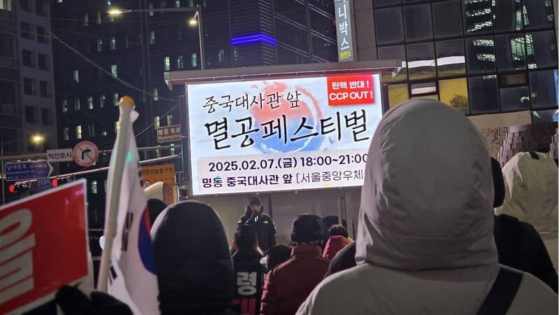 Tối ngày 7/2, xung quanh Đại sứ quán Trung Quốc tại Hàn Quốc ở khu trung tâm Seoul đã diễn ra biểu tình chống Trung Quốc, nhiều người biểu tình đã tổ chức hoạt động “Lễ hội diệt cộng sản”, đồng thời giơ cao khẩu hiệu viết “Đảng Cộng sản Trung Quốc/ĐCSTQ cút đi” (CCP OUT), “Hạ bệ Tập Cận Bình”.