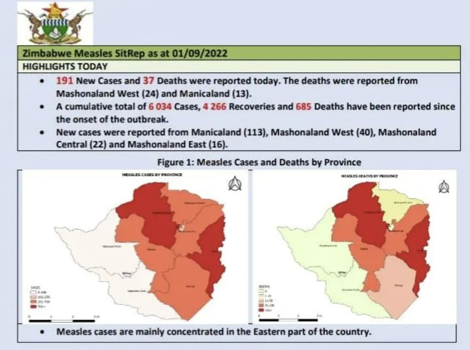 “Zimbabwe có 6.034 trường hợp nhiễm bệnh sởi được xác nhận, bao gồm 4.266 ca đã phục hồi và 685 ca tử vong,” Bộ Y tế cho biết trong một bài đăng trên Twitter. Đáng lưu ý là đã có thêm 191 ca nhiễm mới và 37 trường hợp tử vong chỉ trong một ngày 1/9.