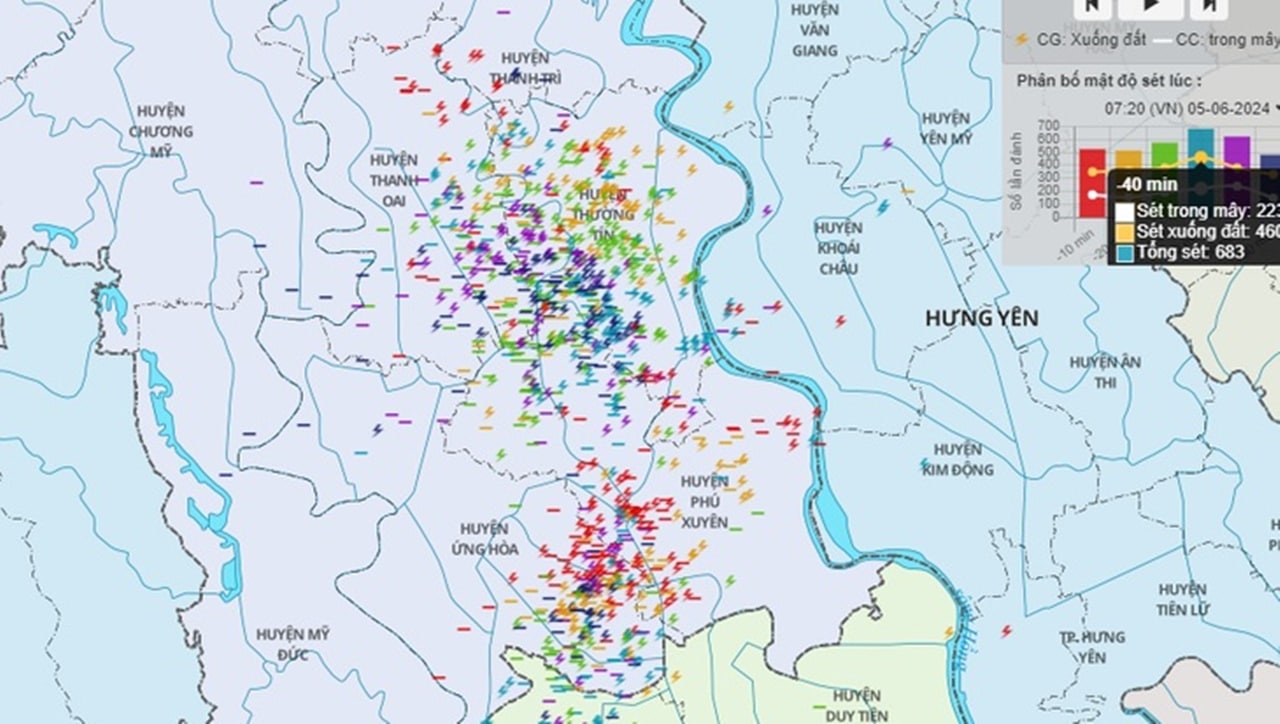 TS Huy cho biết theo số liệu ghi nhận của Trung tâm Khí tượng Thủy văn Quốc gia, từ 6h đến 9h30 sáng 5/6, tổng cộng 10.511 cú sét đã xuất hiện tại Hà Nội và vùng lân cận. Trong đó 7153 cú sét xuống đất, số còn lại đánh trên không trung.