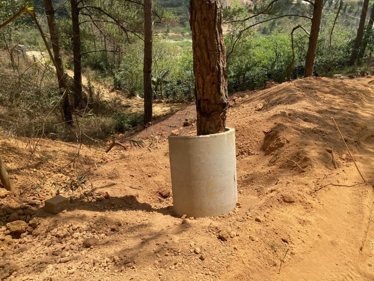 Không chỉ bị đất đỏ lấp gốc, một hàng thông phía công trình giáp đường dân sinh bị xây taluy sát thân, gốc bị gạch vữa lấp kín.