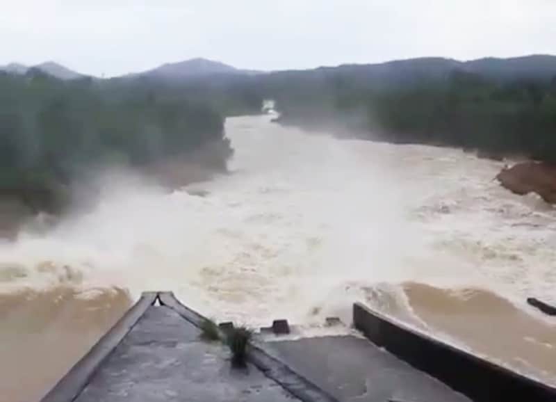 Chiều 10/10, Hồ Vực Mấu, hồ thủy lợi lớn nhất Nghệ An (dung tích 75 triệu m3) xả lũ cả 3 cửa do nước tại hồ chứa đã hơn 87 triệu m3. Nhiều khu vực tại thị xã Hoàng Mai ngập sâu trong biển nước. (Ảnh cắt clip/baonghean.vn)