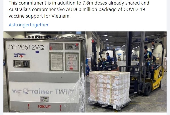 Cũng theo Đại sứ quán Australia tại Việt Nam, cam kết viện trợ của Chính phủ nước này gồm 7,8 triệu liều vắc-xin và gói hỗ trợ vắc-xin ngừa COVID-19 toàn diện của Australia trị giá 60 triệu đô-la Úc cho Việt Nam.