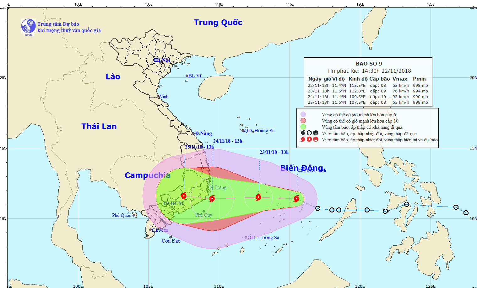 Dự báo trong 24 giờ tới, bão di chuyển theo hướng Tây Tây Bắc mỗi giờ đi được khoảng 15km và có khả năng mạnh thêm. Đến 13h ngày 23/11, vị trí tâm bão ở khoảng 11,5 độ Vĩ Bắc; 112,8 độ Kinh Đông, cách bờ biển các tỉnh Nam Trung Bộ khoảng 340km về phía Đông. Sức gió mạnh nhất vùng gần tâm bão mạnh cấp 9 (75-90km/giờ), giật cấp 11. Bán kính gió mạnh cấp 6, giật cấp 8 khoảng 180km tính từ tâm bão.