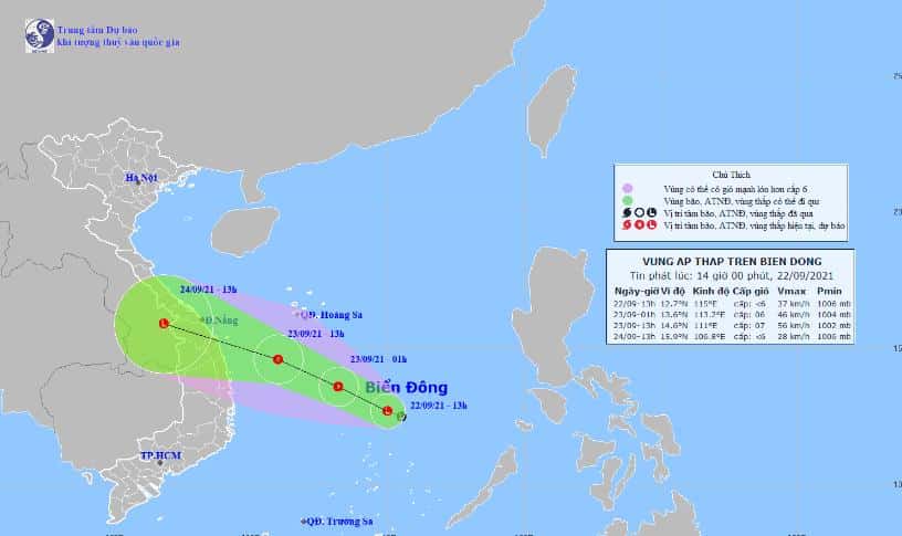 Theo Trung tâm Dự báo Khí tượng Thủy văn Quốc gia, hồi 13h ngày 22/9, vị trí trung tâm vùng áp thấp ở vào khoảng 12,2-13,2 độ Vĩ Bắc; 114,5-115,5 độ Kinh Đông, cách đảo Song Tử Tây khoảng 180km về phía Bắc Đông Bắc.